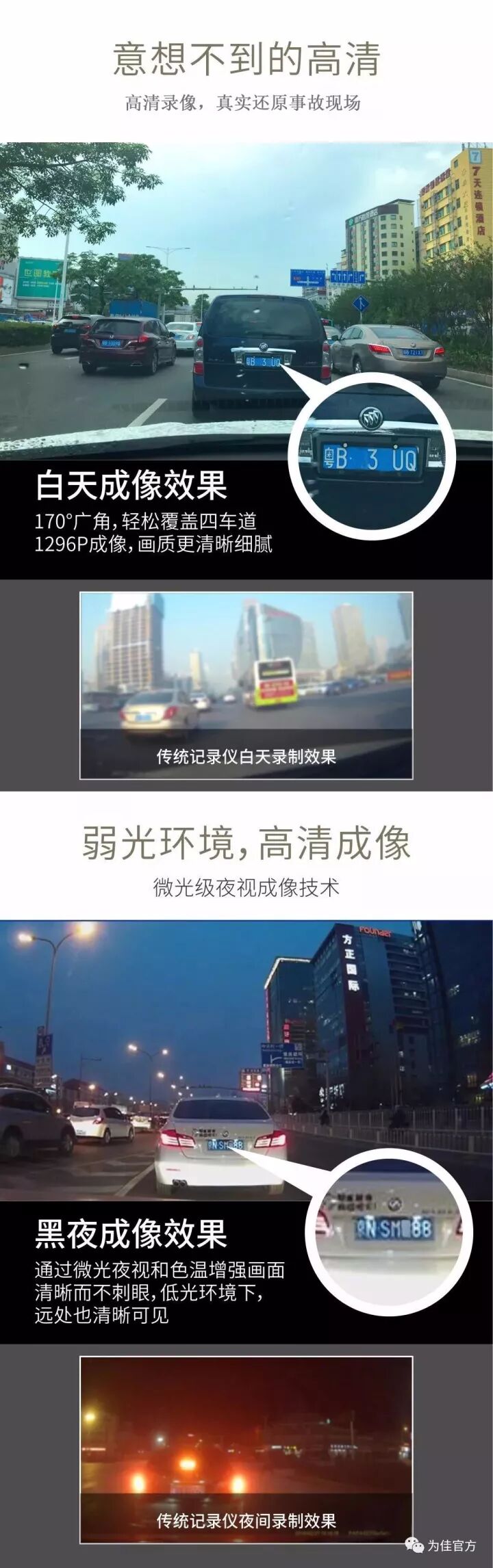为佳N1采用业内少有的7玻索尼镜头,支持1296P高清拍摄,保证高速移动中也能清晰记录前车号牌。